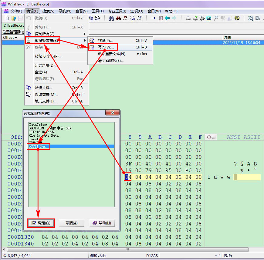 6 _) C* [1 K3 L. W8 Q! B% |横纵、终结红宝石始源蓝宝石的属性相克表在ExtractedRomFS文件夹的DllBattle.cro文件中,日月、究极日月的属性相克表在ExtractedExeFS文件夹的.code.bin文件中,在〖视窗十六进制〗中打开文件,菜单栏选择[搜索]→[查找十六进制数值],输入0404040404020400,即可找到属性相克表。打开《口袋怪兽属性相克表》,选择《六代》工作表,按需修改属性相克,然后点击[复制六代代码](整表)。返回视窗十六进制,鼠标点击属性相克表起始处(0404040404020400的第一个04),菜单栏选择[编辑]→[剪贴板数据]→[写入]→[确定],弹出[选择剪贴板模式]窗口,选择[ASCII Hex]→[确定],菜单栏选择[文件]→[保存]。