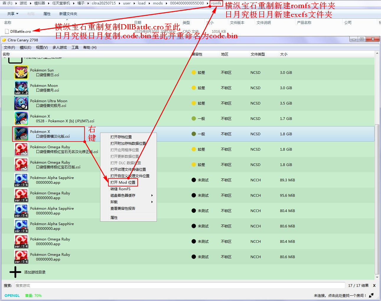 ! y1 U& B8 r. H' z: P e# A在橘子模拟器中[右键游戏]→[打开Mod位置],在打开的文件夹中新建文件夹命名为“romfs”,将修改好的DllBattle.cro复制到romfs文件夹中。( c/ F, ^. u4 R' I4 q9 E, n